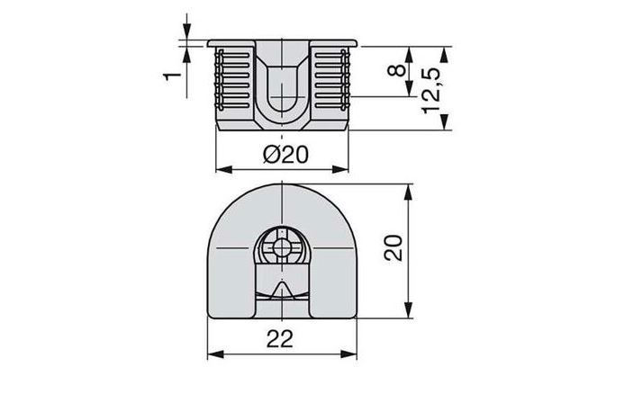 Applicazione tipica: Inserimento in scaffali o pareti divisorie con foro ⌀20 mm (25/32″), profondità 12,5 mm (31/64″), in combinazione con perni eccentrici abbinati.
